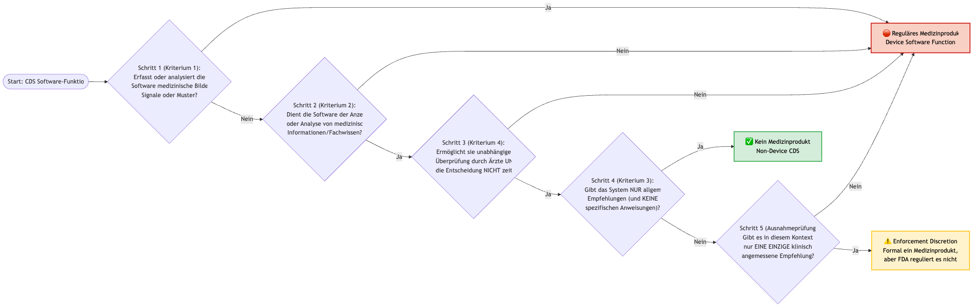 Die FDA hat für Decision Support Systems 2017 ein eigenes Guidance-Dokument als ersten, 2019 als zweiten Entwurf und 2022 final veröffentlicht. Am 6. und am 29. Januar 2026 hat die FDA dieses Dokument ein weiteres Mal überarbeitet. Das Ziel dieser Überarbeitung bestand darin, das Kriterium des „time-critical decision-making“ weitgehend zu streichen, das zuvor eine automatische Regulierung als Medizinprodukt ausgelöst hätte.